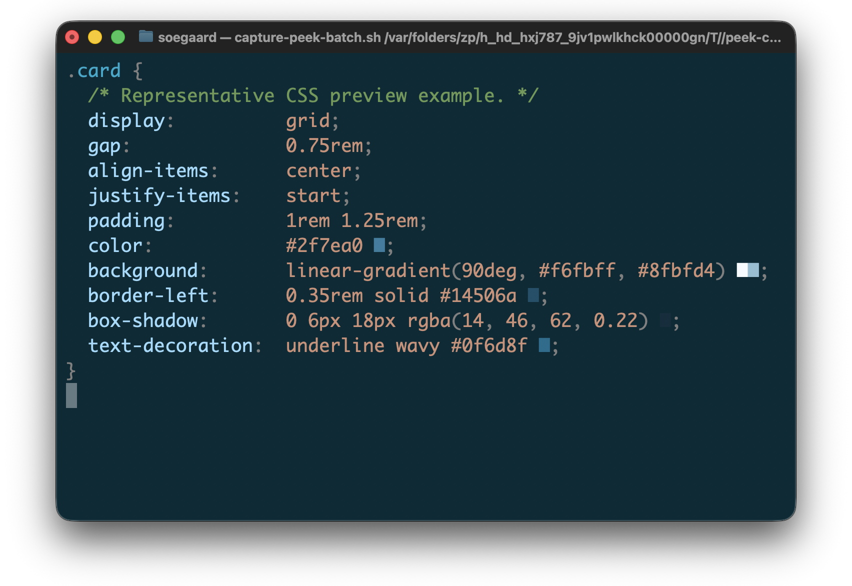 peek path/to/file.css peek -p path/to/file.css cat path/to/file.json | peek --type json