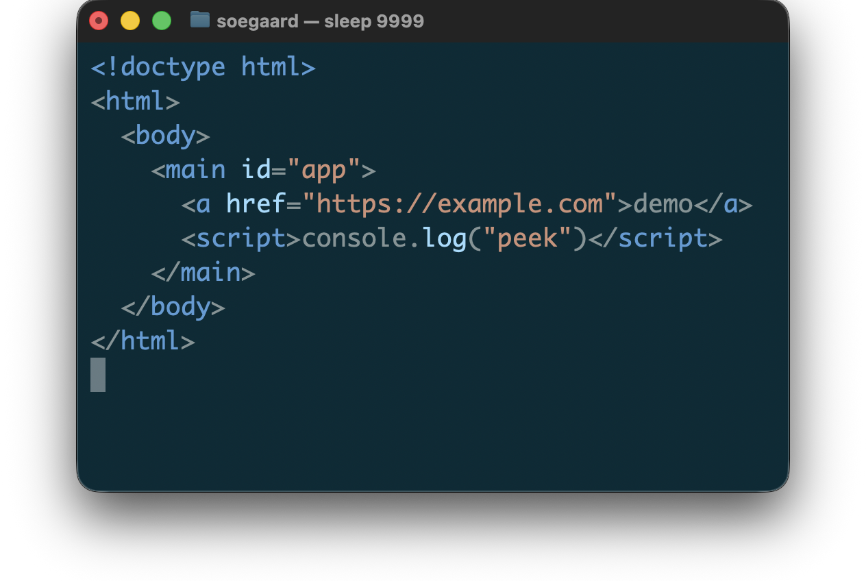 1 <!doctype html> 2 <!-- HTML preview example. --> 3 <html lang="en"> 4 <head> 5 <meta charset="utf-8" /> 6 <title>peek demo</title> 7 </head> 8 <body> 9 <main id="app"><p>Hello & goodbye.</p></main> 10 </body> 11 </html>