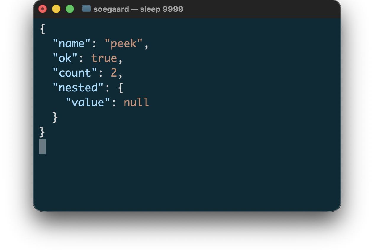 1 { 2 "_comment": "JSON has no real comments, so this field documents the example.", 3 "name": "peek", 4 "ok": true, 5 "count": 2, 6 "tags": ["docs", "preview"] 7 }