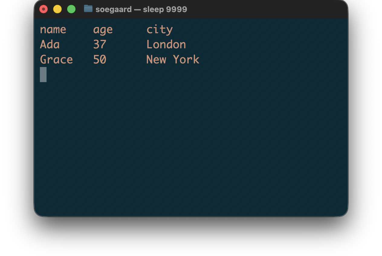 1 # preview data for table mode 2 name age city note 3 Ada 37 London curious 4 Grace 44 New York careful 5 Linus 29 Helsinki calm 6 Mia 31 Aarhus steady