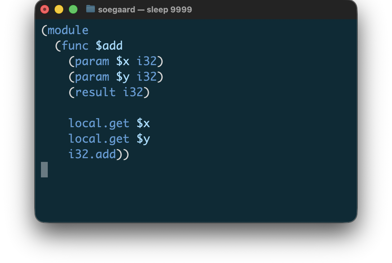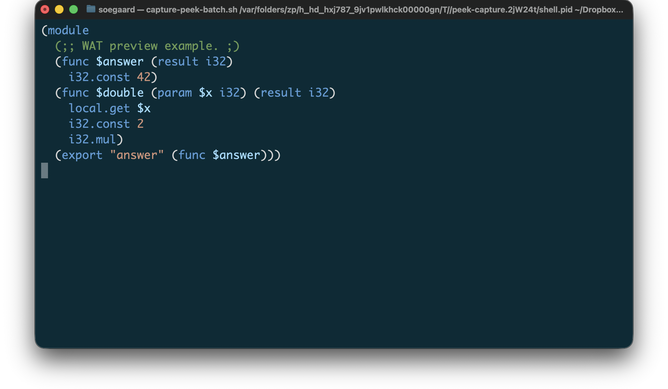 1 (module 2 (;; WAT preview example. ;) 3 (func $answer (result i32) 4 i32.const 42) 5 (func $double (param $x i32) (result i32) 6 local.get $x 7 i32.const 2 8 i32.mul) 9 (export "answer" (func $answer)))