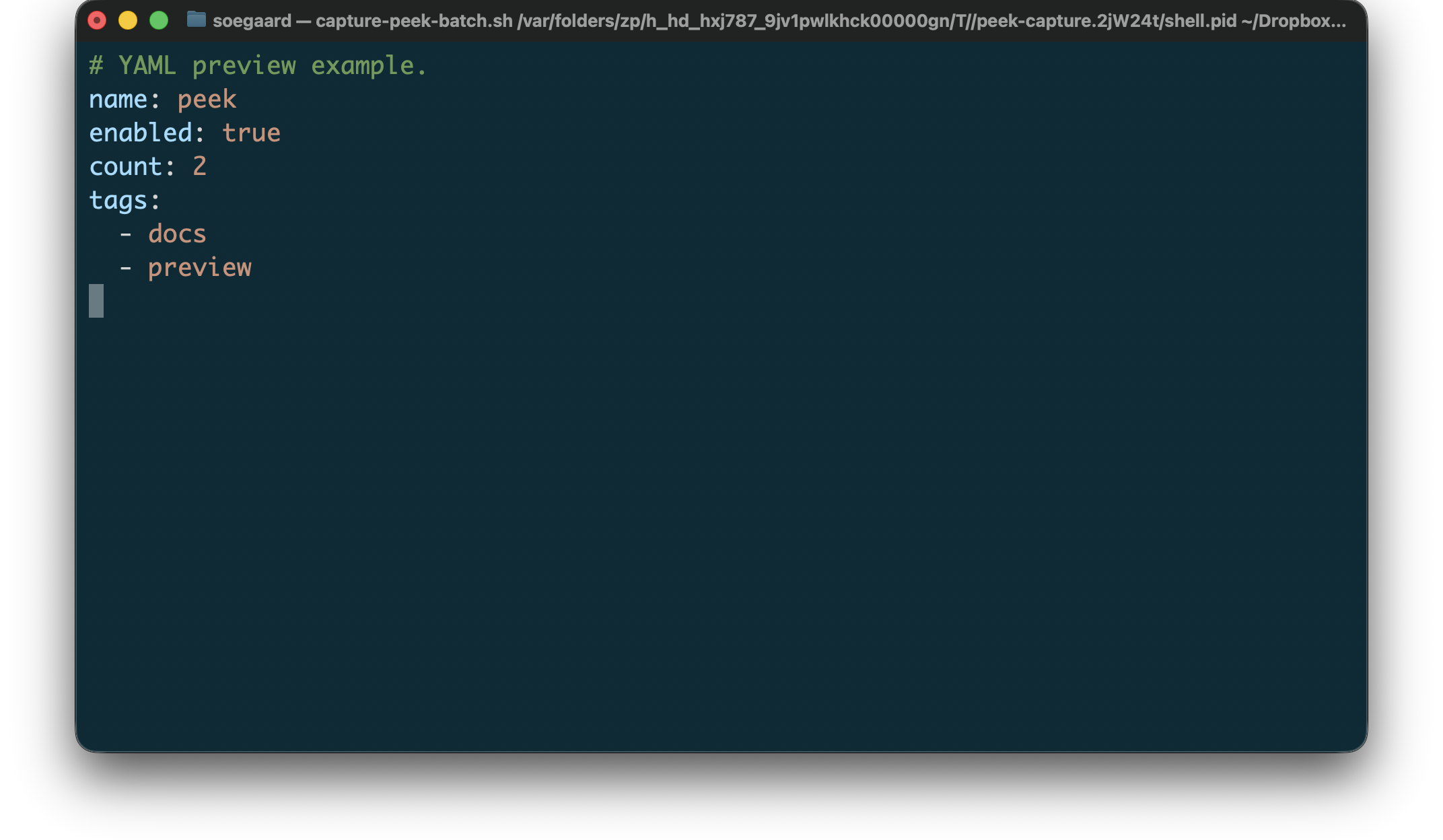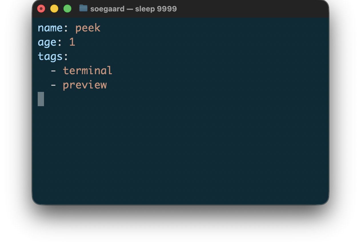 1 # YAML preview example. 2 name: peek 3 enabled: true 4 count: 2 5 tags: 6 - docs 7 - preview