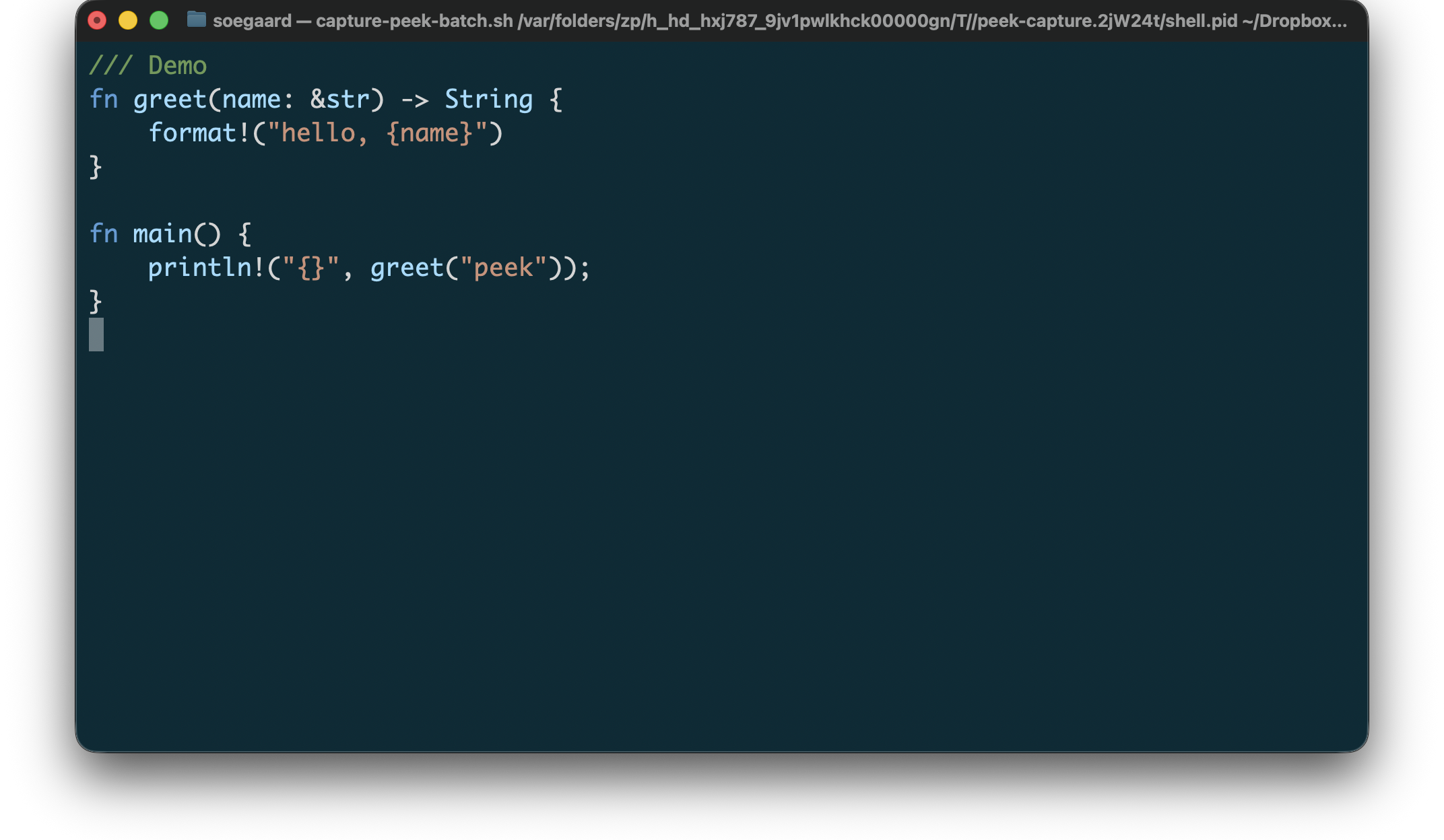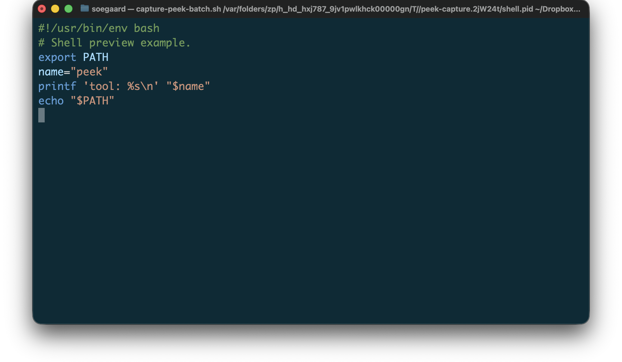 peek previews files directly in the terminal, with syntax-aware coloring for supported file types and a binary fallback for non-text data.